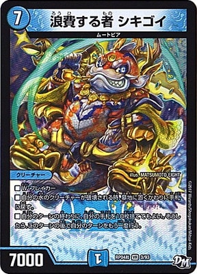 浪費する者 シキゴイ VR 水文明 (7) クリーチャー:ムートピア 7000 W・ブレイカー 自分の水のクリーチャーが破壊される時、墓地に置くかわりに手札に戻す。 自分のターンの終わりに、自分の手札を10枚捨ててもよい。そうしたら、このターンの後で自分のターンをもう一度行う。