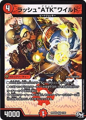 ラッシュ“ATK(アタック)”ワイルド VR 火文明 (4) NEOクリーチャー:ビートジョッキー 4000 NEO進化:自分の火のクリーチャー1体の上に置いてもよい。 キズナコンプ(このクリーチャーが攻撃する時、好きな数の自分のクリーチャーのKP能力を使う) KP−自分のクリーチャーを1体選ぶ。そのクリーチャーのこのターン最初の攻撃の終わりに、それをアンタップする。