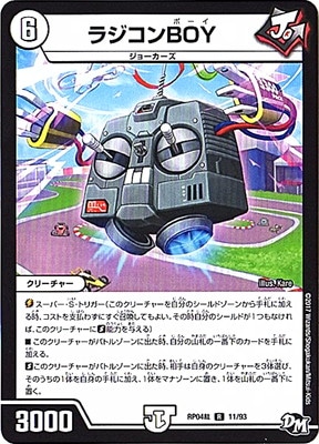 ラジコンBOY R 無色[ジョーカーズ] (6) クリーチャー:ジョーカーズ 3000 スーパー・S・トリガー(このクリーチャーを自分のシールドゾーンから手札に加える時、コストを支払わずにすぐ召喚してもよい。その時自分のシールドが1つもなければ、このクリーチャーにS能力を与える)。 このクリーチャーがバトルゾーンに出た時、自分の山札の一番下のカードを手札に加える。 S−このクリーチャーがバトルゾーンに出た時、相手は自身のクリーチャーを3体選び、そのうちの1体を自身の手札に加え、1体をマナゾーンに置き、1体を山札の一番下に置く。
