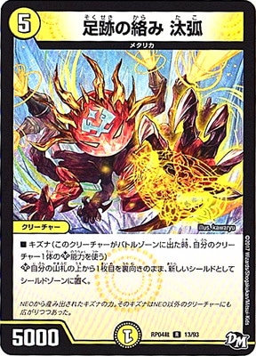 足跡の絡み 汰弧 R 光文明 (5) クリーチャー:メタリカ 5000 キズナ(このクリーチャーがバトルゾーンに出た時、自分のクリーチャー1体のKP能力を使う) KP−自分の山札の上から1枚目を裏向きのまま、新しいシールドとしてシールドゾーンに置く。