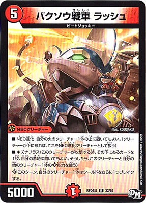 バクソウ戦車 ラッシュ R 火文明 (5) NEOクリーチャー:ビートジョッキー 5000 NEO進化:自分の火のクリーチャー1体の上に置いてもよい。 キズナプラス(このクリーチャーが攻撃する時、その下にあるカードを1枚、自分の墓地に置いてもよい。そうしたら、このクリーチャーと自分の他のクリーチャー1体のK能力を使う) K−このターン、自分のクリーチャー1体はシールドをさらに1つブレイクする。