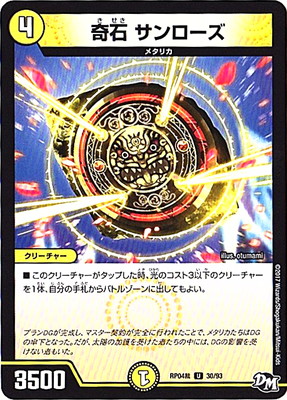 奇石 サンローズ UC 光文明 (4) クリーチャー:メタリカ 3500 このクリーチャーがタップした時、光のコスト3以下のクリーチャーを1体、自分の手札からバトルゾーンに出してもよい。
