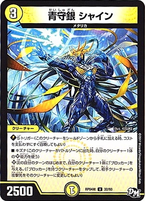 青守銀 シャイン UC 光文明 (3) クリーチャー:メタリカ 2500 S・トリガー(このクリーチャーをシールドゾーンから手札に加える時、コストを支払わずにすぐ召喚してもよい) キズナ(このクリーチャーがバトルゾーンに出た時、自分のクリーチャー1体のKP能力を使う) KP−次の自分のターンのはじめまで、自分のクリーチャー1体に「ブロッカー」を与える。(「ブロッカー」を持つクリーチャーをタップして、相手クリーチャーの攻撃先をそのクリーチャーに変更してもよい)