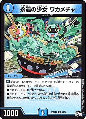 永遠の少女 ワカメチャ UC 水文明 (1) クリーチャー:ムートピア 1000 ブロッカー(このクリーチャーをタップして、相手クリーチャーの攻撃先をこのクリーチャーに変更してもよい) このクリーチャーは攻撃できない。 このクリーチャーがどこからでも自分の墓地に置かれた時、自分の墓地にあるカードをすべてシャッフルし、山札の一番下に置く。