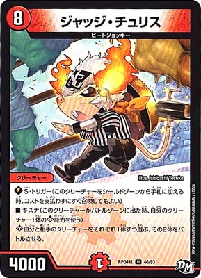 ジャッジ・チュリス UC 火文明 (8) クリーチャー:ビートジョッキー 4000 S・トリガー(このクリーチャーをシールドゾーンから手札に加える時、コストを支払わずにすぐ召喚してもよい) キズナ(このクリーチャーがバトルゾーンに出た時、自分のクリーチャー1体のKP能力を使う) KP−自分と相手のクリーチャーをそれぞれ1体ずつ選ぶ。その2体をバトルさせる。