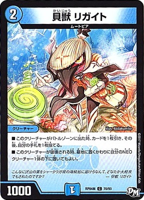 貝獣 リガイト C 水文明 (2) クリーチャー:ムートピア 1000 このクリーチャーがバトルゾーンに出た時、カードを1枚引き、その後、その後、自分の手札を1枚捨てる。 このクリーチャーが破壊される時、墓地に置くかわりに自分のNEOクリーチャー1体の下に置いてもよい。