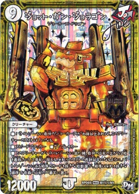 ジョット・ガン・ジョラゴン Joe MAS 無色[ジョーカーズ] (9) クリーチャー:ジョーカーズ・ドラゴン 12000 バトルゾーンに自分のジョーカーズが6体以上あれば、このクリーチャーを召喚するコストは1になる。 スピードアタッカー T・ブレイカー このクリーチャーがバトルゾーンに出た時、自分の山札の上から2枚を表向きにして手札に加える。それらのコストの合計以下になるように、バトルゾーンにある相手のカードを好きな枚数選ぶ。相手はそれを好きな順序で自身の山札の一番下に置く。