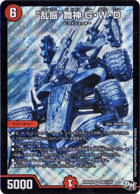 “乱振(ランブル)”舞神(マシン) G・W・D SR 火文明 (6) クリーチャー:ビートジョッキー 5000 B・A・D2 スピードアタッカー このクリーチャーがバトルゾーンに出た時または攻撃する時、相手のクリーチャーを1体選んでもよい。その選んだクリーチャーとこのクリーチャーをバトルさせる。 このクリーチャーは、可能なら毎ターン、相手プレイヤーを攻撃する。 自分のクリーチャーがバトルに勝った時、カードを1枚引く。