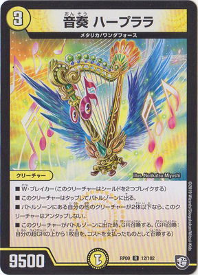 音奏 ハープララ R 光文明 (3) クリーチャー:メタリカ/ワンダフォース 9500 W・ブレイカー(このクリーチャーはシールドを2つブレイクする) このクリーチャーはタップしてバトルゾーンに出る。 バトルゾーンにある自分の他のクリーチャーが2体以下なら、このクリーチャーはアンタップしない。 このクリーチャーがバトルゾーンに出た時、GR召喚する。(GR召喚:自分の超GRの上から1枚目を、コストを支払ったものとして召喚する