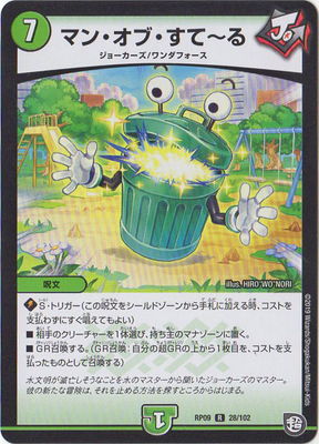 マン・オブ・すて〜る R 自然文明[ジョーカーズ] (7) 呪文:ジョーカーズ/ワンダフォース S・トリガー 相手のクリーチャーを1体選び、持ち主のマナゾーンに置く。 GR召喚する。(GR召喚:自分の超GRの上から1枚目を、コストを支払ったものとして召喚する)
