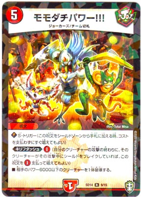 モモダチパワー!!! R 火文明 (5) 呪文:ジョーカーズ/チーム切札 S・トリガー(この呪文をシールドゾーンから手札に加える時、コストを支払わずにすぐ唱えてもよい) <キリフダッシュ>[火(1)](自分のクリーチャーの攻撃の終わりに、そのクリーチャーがその攻撃中にシールドをブレイクしていれば、この呪文を[火(1)]支払って唱えてもよい) 相手のパワー6000以下のクリーチャーを1体破壊する。