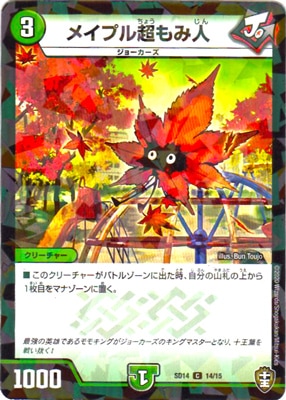 メイプル超もみ人 C 自然文明[ジョーカーズ] (3) クリーチャー:ジョーカーズ 1000 このクリーチャーがバトルゾーンに出た時、自分の山札の上から1枚目をマナゾーンに置く。