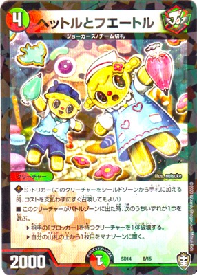 ヘットルとフェートル(P) ? /自然文明 (4) クリーチャー:ジョーカーズ/チーム切札 2000 S・トリガー(このクリーチャーをシールドゾーンから手札に加える時、コストを支払わずにすぐ召喚してもよい) このクリーチャーがバトルゾーンに出た時、次のうちいずれか1つを選ぶ。 相手の「ブロッカー」を持つクリーチャーを1体破壊する。 自分の山札の上から1枚目をマナゾーンに置く。