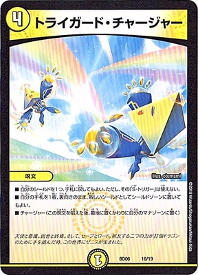 トライガード・チャージャー P 光文明 (4) 呪文 自分のシールドを1つ、手札に加えてもよい。ただし、その「S・トリガー」能力は使えない。 自分の手札を1枚、裏向きのまま、新しいシールドとしてシールドゾーンに加えてもよい。 チャージャー