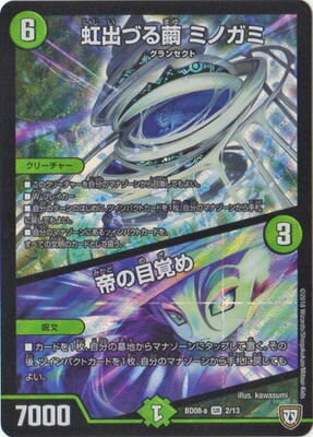 虹出づる繭 ミノガミ SR 自然文明 (6) クリーチャー:グランセクト 7000 このクリーチャーを自分のマナゾーンから召喚してもよい。 W・ブレイカー 自分のターンのはじめに、ツインパクトカードを1枚、自分のマナゾーンから手札に戻してもよい。 自分のマナゾーンにあるツインパクトカードをすべての文明のカードとして扱う。 帝の目覚め SR 自然文明 (3) 呪文 カードを1枚、自分の墓地からマナゾーンにタップして置く。その後、ツインパクトカードを1枚、自分のマナゾーンから手札に戻してもよい。