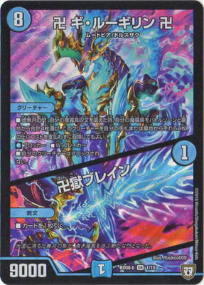 卍 ギ・ルーギリン 卍 SR 水文明 (8) クリーチャー:ムートピア/ドルスザク 9000 虚無月の門:自分の魔導具呪文を唱えた時、自分の魔導具をバトルゾーンと墓地から合計4枚選び、このクリーチャーを自分の手札または墓地からそれら4枚の上にコストを支払わずに召喚してもよい。 ブロッカー W・ブレイカー 自分のクリーチャーはブロックされない。 卍獄ブレイン SR 水文明 (1) 呪文 カードを1枚引く。