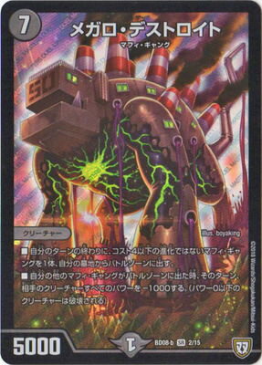 メガロ・デストロイト SR 闇文明 (7) クリーチャー:マフィ・ギャング 5000 自分のターンの終わりに、コスト4以下の進化ではないマフィ・ギャングを1体、自分の墓地からバトルゾーンに出す。 自分の他のマフィ・ギャングがバトルゾーンに出た時、そのターン、相手のクリーチャーすべてのパワーを-1000する。(パワー0以下のクリーチャーは破壊される)