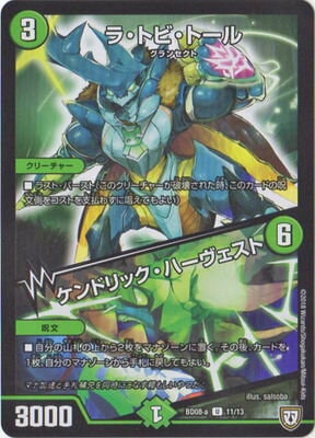 ラ・トビ・トール UC 自然文明 (3) クリーチャー:グランセクト 3000 ラスト・バースト(このクリーチャーが破壊された時、このカードの呪文側をコストを支払わずに唱えてもよい) ケンドリック・ハーヴェスト UC 自然文明 (6) 呪文 自分の山札の上から2枚をマナゾーンに置く。その後、カードを1枚、自分のマナゾーンから手札に戻してもよい。