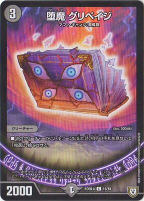 堕魔 グリペイジ C 闇文明 (3) クリーチャー:マフィ・ギャング/魔導具 2000 このクリーチャーがバトルゾーンに出た時、相手の手札を見ないで1枚選び、捨てさせる。