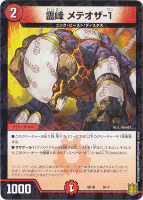 霊峰 メテオザ-1 P 火文明 (2) クリーチャー:ロック・ビースト/ディスタス 1000 このクリーチャーが出た時、相手のパワー2000以下のクリーチャーを1体破壊する。 ササゲール1(ディスペクターを召喚する時、コストを1少なくしてもよい。そうしたら、このクリーチャーを破壊する。そのディスペクターのコストは0以下にはならない)