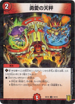 勇愛の天秤 UC 火文明 (2) 呪文 S・トリガー 次のうちいずれかひとつを選ぶ。 ?手札を1枚捨て、その後、カードを2枚引く。 ?相手のパワー2000以下のクリーチャーを1体破壊する。