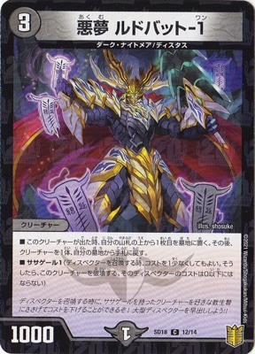悪夢 ルドバット-1 C 闇文明 (3) クリーチャー:ダーク・ナイトメア/ディスタス 1000 このクリーチャーが出た時、自分の山札の上から1枚目を墓地に置く。その後、クリーチャーを1体、自分の墓地から手札に戻す。 ササゲール1(ディスペクターを召喚する時、コストを1少なくしてもよい。そうしたら、このクリーチャーを破壊する。そのディスペクターのコストは0以下にはならない)