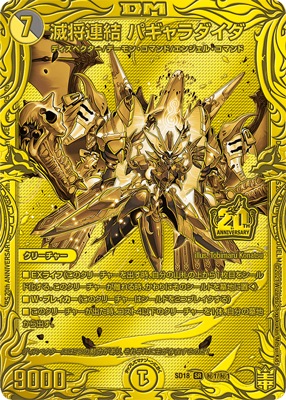 滅将連結 パギャラダイダ SR 光/闇文明 (7) クリーチャー:ディスペクター/デーモン・コマンド/エンジェル・コマンド 9000 EXライフ(このクリーチャーを出す時、自分の山札の上から1枚目をシールド化する。このクリーチャーが離れる時、かわりにそのシールドを墓地に置く) W・ブレイカー(このクリーチャーはシールドを2つブレイクする) このクリーチャーが出た時、コスト4以下のクリーチャーを1体、自分の墓地から出す。