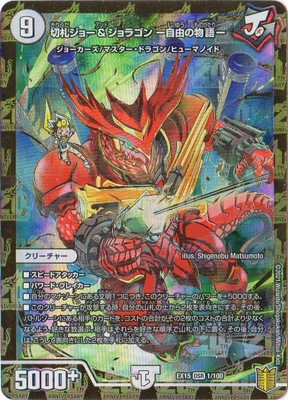 切札ジョー&ジョラゴン -自由の物語- DSR 無色[ジョーカーズ] (9) クリーチャー:ジョーカーズ/マスター・ドラゴン/ヒューマノイド 5000+ スピードアタッカー パワード・ブレイカー 自分のマナゾーンにある文明1つにつき、このクリーチャーのパワーを+5000する。 このクリーチャーが攻撃する時、自分の山札の上から2枚を表向きにする。その後、バトルゾーンにある相手のカードを、コストの合計がその2枚のコストの合計より少なくなるよう、好きな数選ぶ。相手はそれらを好きな順序で山札の下に置く。その後、自分は、こうして表向きにした2枚を手札に加える。