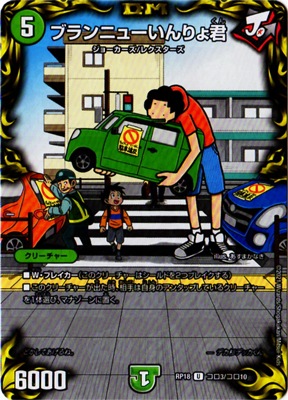 ブランニューいんりょ君 UC 自然文明 (5) クリーチャー:ジョーカーズ/レクスターズ 6000 W・ブレイカー(このクリーチャーはシールドを2つブレイクする) このクリーチャーが出た時、相手は自身のアンタップしているクリーチャーを1体選び、マナゾーンに置く。