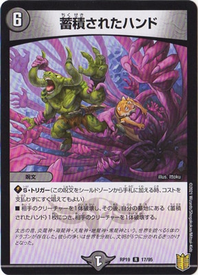 蓄積されたハンド R 闇文明 (6) 呪文 S・トリガー(この呪文をシールドゾーンから手札に加える時、コストを支払わずにすぐ唱えてもよい) 相手のクリーチャーを1体破壊し、その後、自分の墓地にある 《蓄積されたハンド》1枚につき、相手のクリーチャーを1体破壊する。
