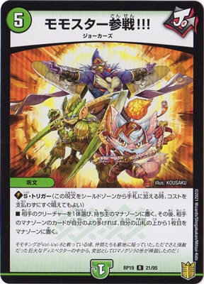 モモスター参戦!!! R 自然文明[ジョーカーズ] (5) 呪文:ジョーカーズ S・トリガー(この呪文をシールドゾーンから手札に加える時、コストを支払わずにすぐ唱えてもよい) 相手のクリーチャーを1体選び、持ち主のマナゾーンに置く。その後、相手のマナゾーンのカードが自分のより多ければ、自分の山札の上から1枚目をマナゾーンに置く。