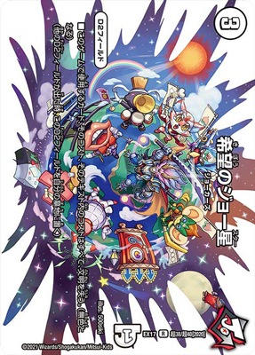 希望のジョー星 R 無色 (3) D2フィールド:ジョーカーズ このゲームで使用するカード、そのコスト、そのテキスト内のコストはすべて、文明を失う。(無色となる) (他のD2フィールドが出た時、このD2フィールドを自分の墓地に置く)