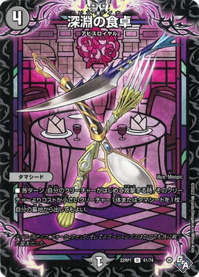 深淵の食卓 UC 闇文明 (4) タマシード:アビスロイヤル 各ターン、自分のクリーチャーがはじめて攻撃する時、そのクリーチャーよりコストが小さいクリーチャー1体またはタマシードを1枚、自分の墓地から出してもよい。