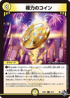 権力のコイン C 光文明 (3) タマシード S・トリガー(このタマシードをシールドゾーンから手札に加える時、コストを支払わずにすぐ使ってもよい) このタマシードまたは、名前に《権力のコイン》とある自分の他のタマシードが出た時、相手のクリーチャーを1体選んでタップする。次の相手のターンのはじめに、そのクリーチャーはアンタップしない。