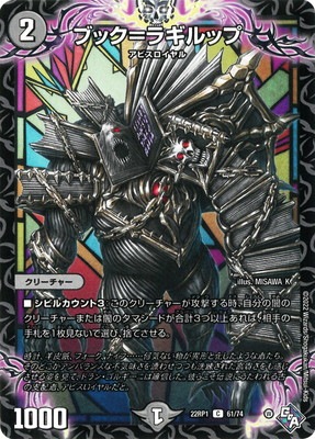 ブック=ラギルップ C 闇文明 (2) クリーチャー:アビスロイヤル 1000 シビルカウント3:このクリーチャーが攻撃する時、自分の闇のクリーチャーまたは闇のタマシードが合計3つ以上あれば、相手の手札を1枚見ないで選び、捨てさせる。