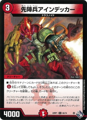 先陣兵アインデッカー C 火文明 (3) クリーチャー:ドラゴノイド 4000 自分のマナゾーンにカードが3枚以上あれば、このクリーチャーを[火(1)]支払って召喚してもよい。そうしたら、このターンの終わりにこのクリーチャーを破壊し、その後、カードを1枚引く。
