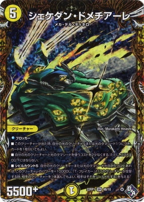 シェケダン・ドメチアーレ SR 光文明 (5) クリーチャー:メカ・デル・ディネロ 5500+ ブロッカー このクリーチャーが出た時、自分の光のクリーチャーまたは光のタマシード1つにつき、カードを1枚引いてもよい。 自分の光のクリーチャーと光のタマシードを使うコストを2少なくする。ただし、コストは0以下にはならない。 シビルカウント5:自分の光のクリーチャーまたは光のタマシードが合計5つ以上あれば、このクリーチャーのパワーを+10000し、「T・ブレイカー」と「このクリーチャーが攻撃する時、相手のクリーチャーを1体選んでもよい。相手はそれをシールド化する」を与える。