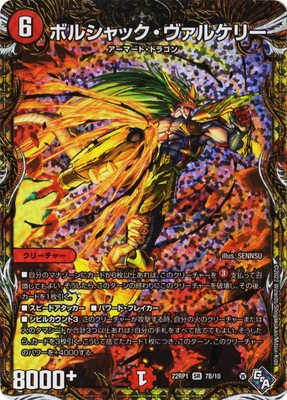 ボルシャック・ヴァルケリー SR 火文明 (6) クリーチャー:アーマード・ドラゴン 8000+ 自分のマナゾーンにカードが6枚以上あれば、このクリーチャーを[火(3)]支払って召喚してもよい。そうしたら、このターンの終わりにこのクリーチャーを破壊し、その後、カードを1枚引く。 スピードアタッカー パワード・ブレイカー シビルカウント3:このクリーチャーが攻撃する時、自分の火のクリーチャーまたは火のタマシードが合計3つ以上あれば、自分の手札をすべて捨ててもよい。そうしたら、カードを3枚引く。こうして捨てたカード1枚につき、このターン、このクリーチャーのパワーを+4000する。