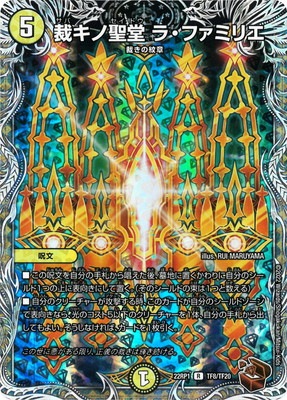 裁キノ聖堂 ラ・ファミリエ R 光文明 (5) 呪文:裁きの紋章 この呪文を自分の手札から唱えた後、墓地に置くかわりに自分のシールド1つの上に表向きにして置く。(そのシールドの束は1つと数える) 自分のクリーチャーが攻撃する時、このカードが自分のシールドゾーンで表向きなら、光のコスト5以下のクリーチャーを1体、自分の手札からバトルゾーンに出してもよい。そうしなければ、カードを1枚引く。