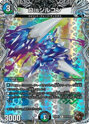Disジルコン R 水/闇/自然文明 (3) クリーチャー:スピリット・クォーツ/ディスタス 3000 ブロッカー(このクリーチャーをタップして、相手クリーチャーの攻撃先をこのクリーチャーに変更してもよい) このクリーチャーを、自分のマナゾーンまたは墓地から召喚してもよい。 このクリーチャーが出た時、カードを2枚引き、自分の手札を1枚捨てる。