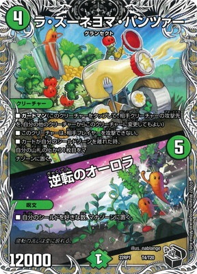 ラ・ズーネヨマ・パンツァー P 自然文明 (4) クリーチャー:グランセクト 12000 ガードマン(このクリーチャーをタップして、相手クリーチャーの攻撃先を、自分の他のクリーチャーからこのクリーチャーに変更してもよい) このクリーチャーは、相手プレイヤーを攻撃できない。 カードが自分のシールドゾーンを離れた時、自分の山札の上から1枚目をマナゾーンに置く。 逆転のオーロラ P 自然文明 (5) 呪文 自分のシールドを好きな数、マナゾーンに置く。