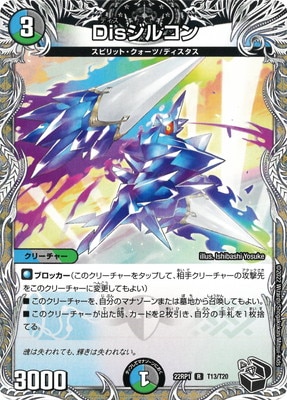 Disジルコン R 水/闇/自然文明 (3) クリーチャー:スピリット・クォーツ/ディスタス 3000 ブロッカー(このクリーチャーをタップして、相手クリーチャーの攻撃先をこのクリーチャーに変更してもよい) このクリーチャーを、自分のマナゾーンまたは墓地から召喚してもよい。 このクリーチャーが出た時、カードを2枚引き、自分の手札を1枚捨てる。