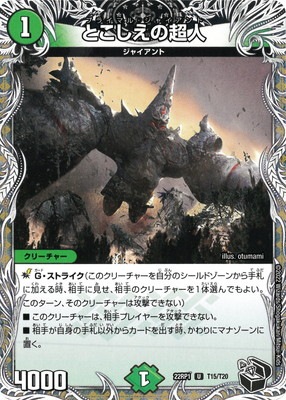 とこしえの超人 UC 自然文明 (1) クリーチャー:ジャイアント 4000 G・ストライク(このクリーチャーを自分のシールドゾーンから手札に加える時、相手に見せ、相手のクリーチャーを1体選んでもよい。このターン、そのクリーチャーは攻撃できない) このクリーチャーは、相手プレイヤーを攻撃できない。 相手が自身の手札以外からカードを出す時、かわりにマナゾーンに置く。