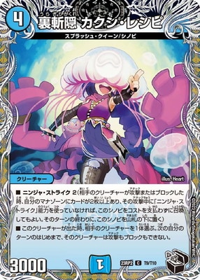 裏斬隠 カクシ・レシピ C 水文明 (4) クリーチャー:スプラッシュ・クイーン/シノビ 3000 ニンジャ・ストライク2(相手のクリーチャーが攻撃またはブロックした時、自分のマナゾーンにカードが2枚以上あり、その攻撃中に「ニンジャ・ストライク」能力を使っていなければ、このシノビをコストを支払わずに召喚してもよい。そのターンの終わりに、このシノビを山札の下に置く) このクリーチャーが出た時、相手のクリーチャーを1体選ぶ。次の自分のターンのはじめまで、そのクリーチャーは攻撃もブロックもできない。